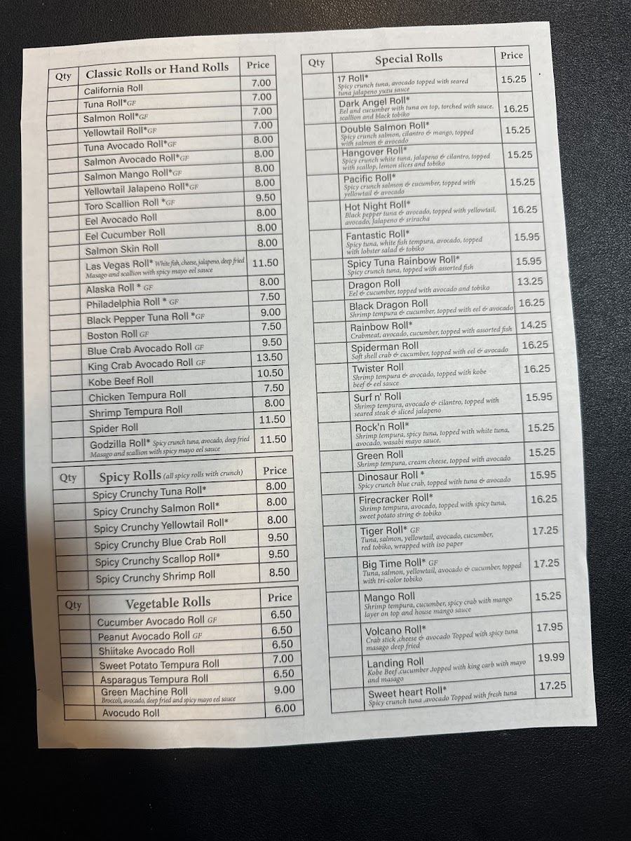 8 pcs salmon avocado roll, 8 pcs California roll, 8 pcs sweet potato roll, 8 pcs Alaska roll, 8 pcs spicy Crunchy tuna roll, 8 pcs shrimp tempura roll, 8 pcs Philadelphia roll, 8 pcs cucumber avocado roll, 8 pcs eel avocado roll. *Each roll served in 8 piece cut
