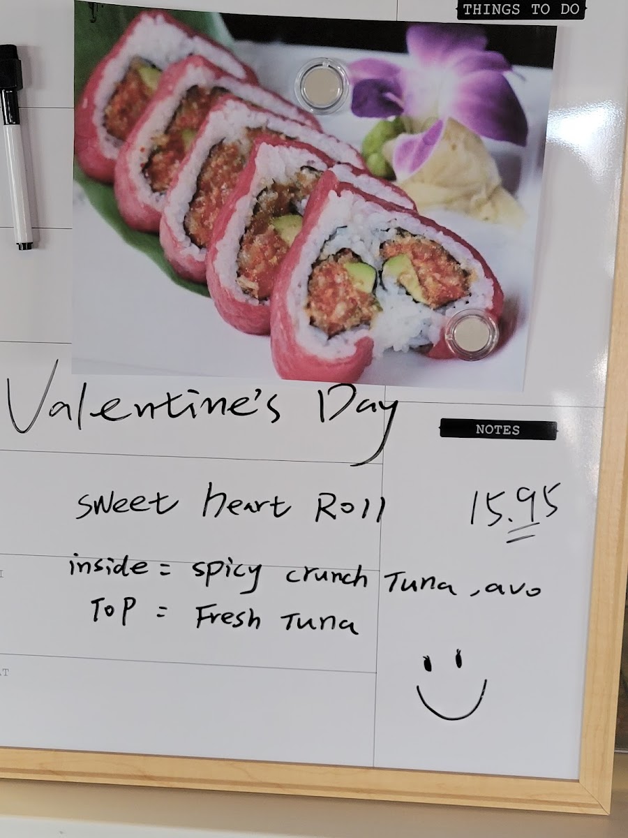 Spicy crunch white fish, jalapeno and cilantro topped with scallop, lemon slices & tobiko